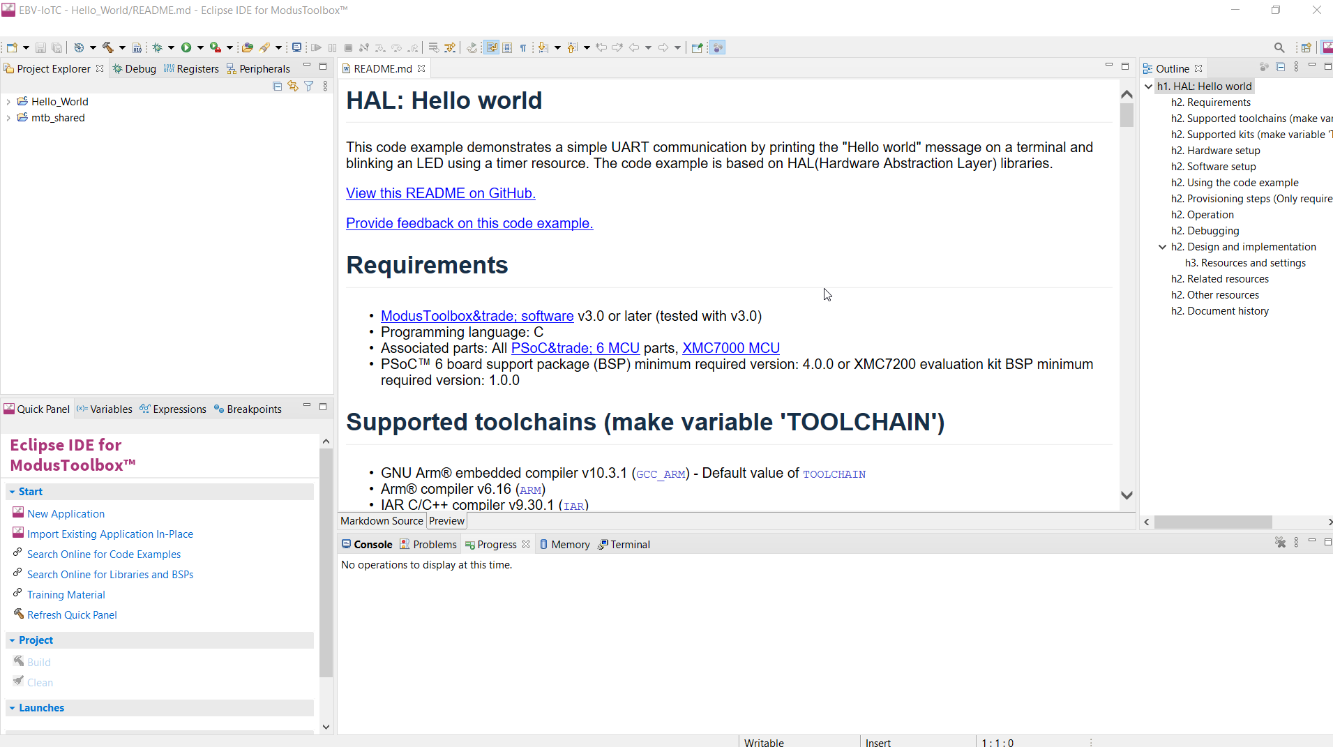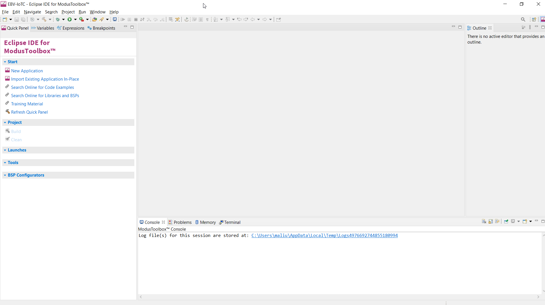 The IDE contains Eclipse standard menus and toolbars, plus various panes such as the Project Explorer, Code Editor, and Console. One difference from the standard Eclipse IDE is the "ModusToolbox™ Perspective". This perspective provides the "Quick Panel", and adds tabs to the Project Explorer. "Perspective" is an Eclipse term for the initial set and layout of views in the IDE.