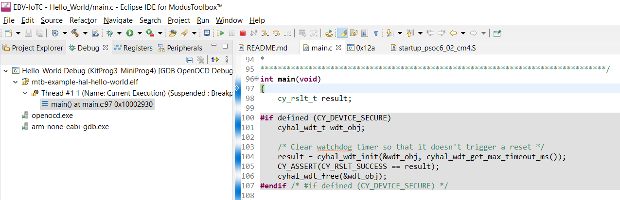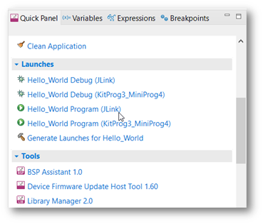 One of the most advanced features of the toolchain is definitely step-by-step debugging. In the Project Explorer, select the desired project. Then, in the Quick Panel, click the Hello_World Debug (KitProg3_MiniProg4) link for a PSoC™ MCU application