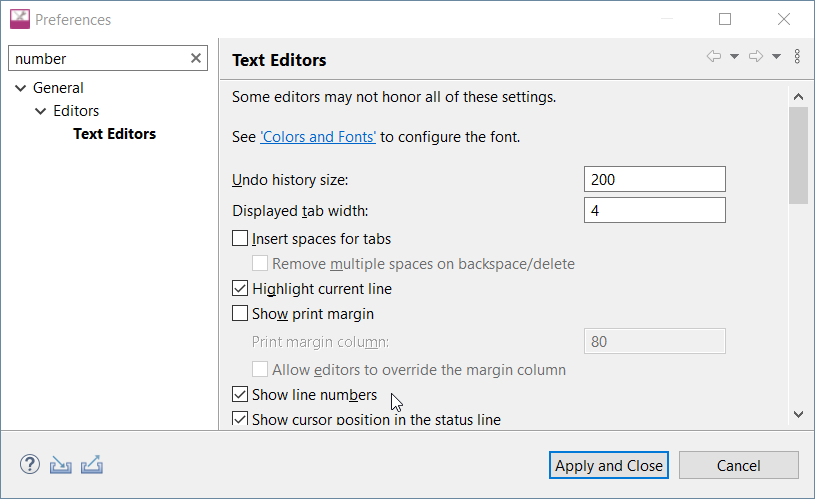 Tip: It is convenient to have line numbers shown in the IDE. Please go for Window→Preferences now search for “number” or go for General→Editors→Text Editors and check “Show line numbers” and click Apply and Close. |