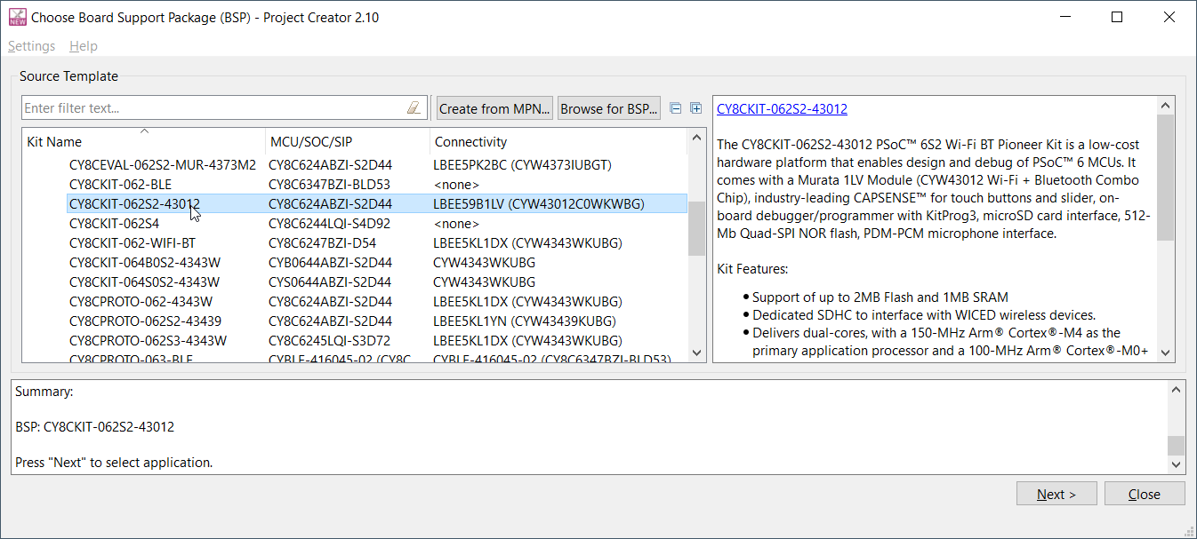 These commands launch the “Project Creator” tool with Board Support Package (BSP) selection, which displays a list of boards, showing the Kit Name, MCU, and Connectivity Device (if applicable). As you select each of the kits shown, the description for that kit displays on the right. Depending on the settings for your system, you may see different categories, including PSoC™ 4, PSoC™ 6, and AIROC™ Bluetooth® BSPs. For this example, select the CY8CKIT-062S2-43012 kit and click Next.