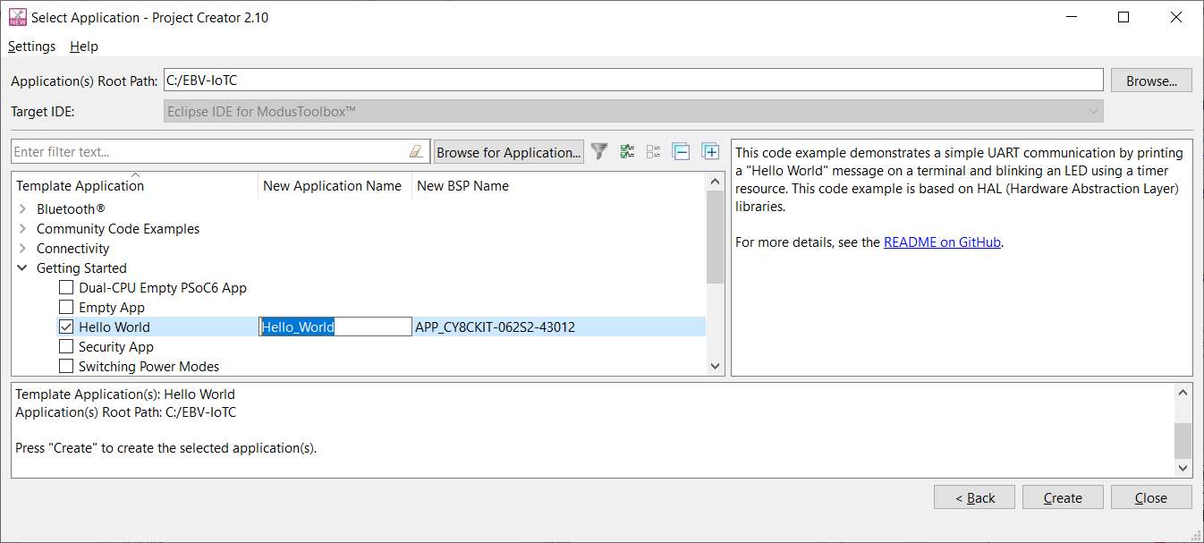 Next, “Select application” window is opened listing various applications available for the selected kit. As you select an application, a description displays on the right. You can select multiple applications for the selected BSP by enabling the check box next to the applicable applications. In the Project Creator - Select Application dialog, choose the example by enabling the checkbox. Go to “Getting Started” and select check box next to the "Hello World" application. Optionally, you can change the suggested New Application Name. Click Create to complete the application creation process.