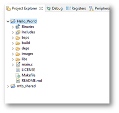 In the Eclipse IDE, after creating an application, the Project Explorer contains one or more related project folders. The following images show our “Hello_world” PSoC™ MCU application.
