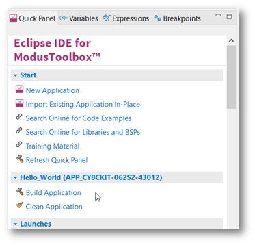 After loading an application, build it to generate the necessary files. Select a project. Then, in the Quick Panel, click the Build Application link. The following images show the Quick Panel for a typical PSoC™ MCU application.