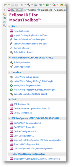 As stated previously, the “Quick Panel” is part of the "ModusToolbox™ Perspective”. It provides quick access to commands and documentation based on what you have selected in the “Project Explorer”.