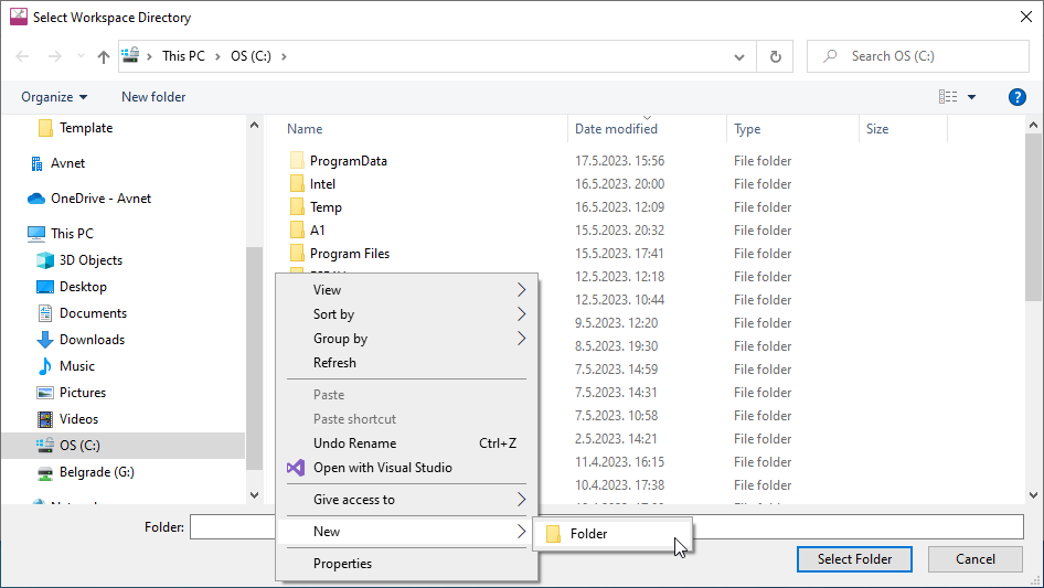 - create new directory by clicking Browse and then inside the File explorer right click and go for New→Folder, name the folder, select newly created folder, and click Select Folder,
