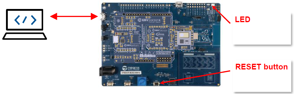 Then only plug your laptop to the PSoC Kit USB programming interface as shown below: